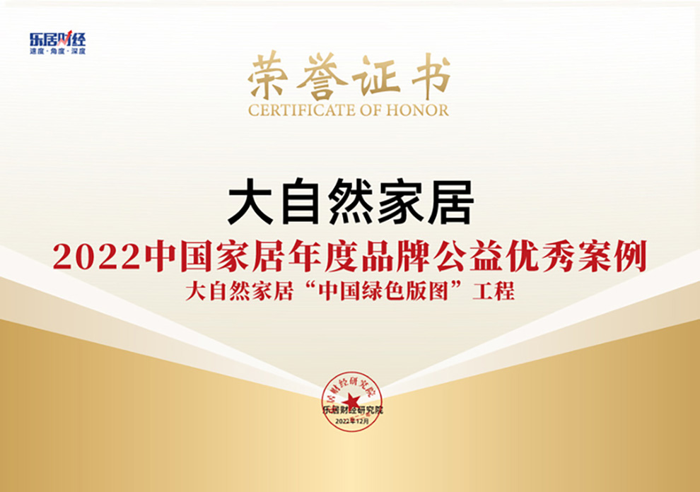 2022年12月28日,2022(第六屆)中國地產新時代盛典舉行。本屆活動由樂居財經主辦,中國房地產業協會、全國工商聯家具裝飾業商會共同指導,新浪財經、中國企業家、中房網聯合主辦。大自然家居的“‘中國綠色版圖’工程”榮獲“2022中國家居年度品牌公益優秀案例”。